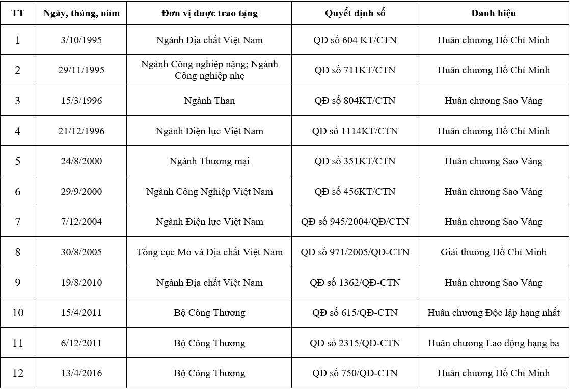 Năm 1995: Chủ tịch nước tặng thưởng Huân chương Hồ Chí Minh cho Bộ Công nghiệp nặng (Quyết định số 711 KT/CT ngày 29/11/1995).